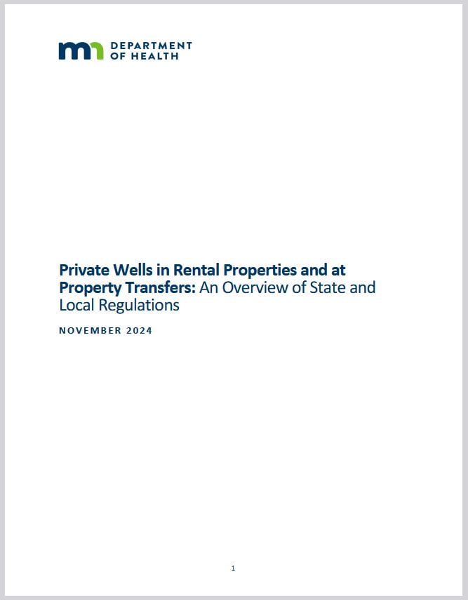 This report, from the Minnesota Department of Health, serves as a reference for local governments on the subject of private wells on rental properties/property transfers by providing insight into current regulations and offering ideas on potential language and approaches for ordinances aimed at enhancing safe drinking water access for private well users within communities.