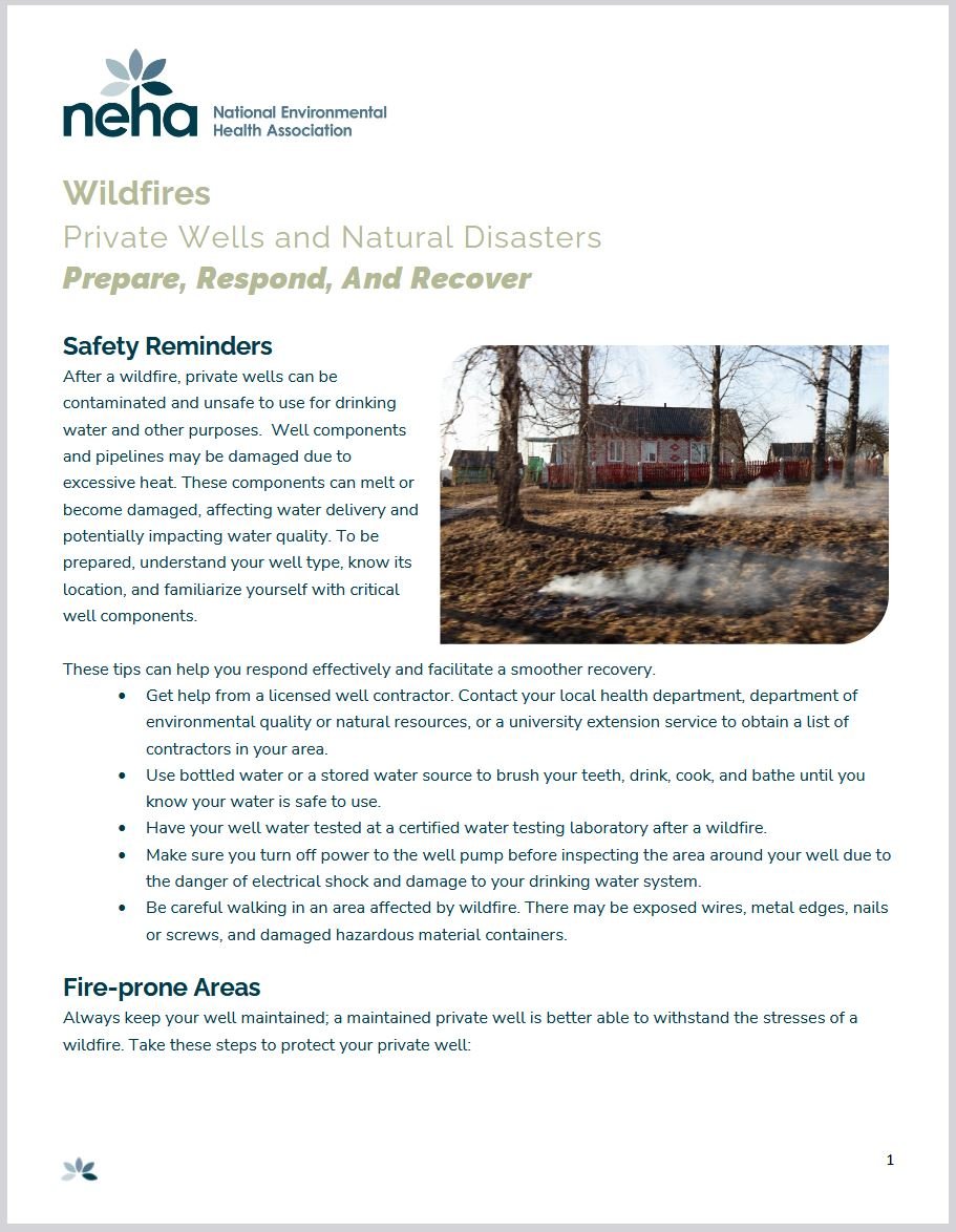 This guide, from NEHA, offers instructions on how to prepare, respond, and recover from a wildfire affecting a property with a private well. It covers safety reminders, well maintenance for fire-prone areas, and steps for each stage of a wildfire.