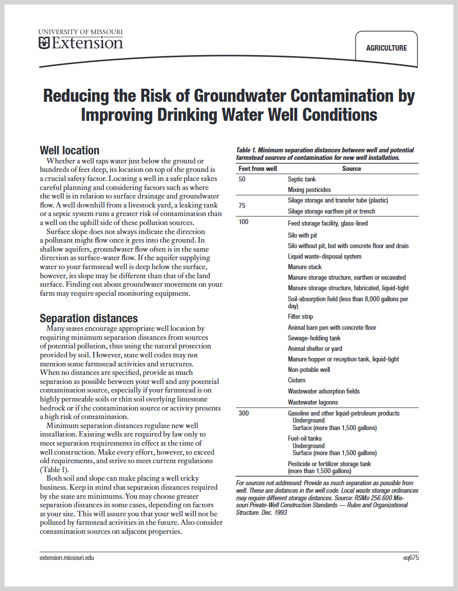 This document, from University of Missouri Extension, offers guidance on improving drinking water well conditions and reducing the risk of groundwater contamination. It covers well location, separation distances, well construction, well types, well management and maintenance, unused wells, and more.