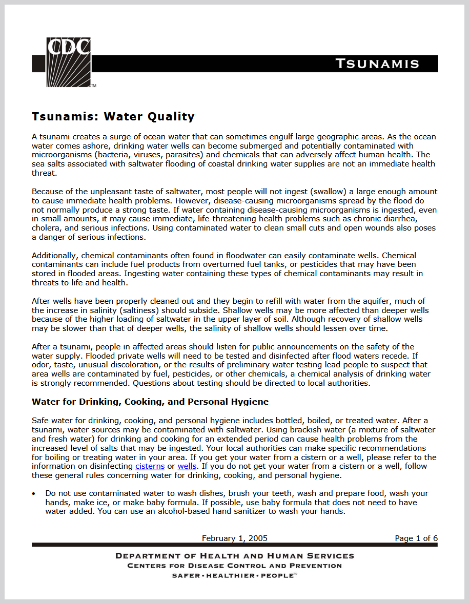 This guide from the CDC explains how tsunamis can affect water quality, and residents in an area affected by one should do in order to avoid contaminated water and ensure the safety of their drinking water. Different types of wells can be affected in different ways, but generally speaking, they should all be disinfected in the wake of a tsunami.